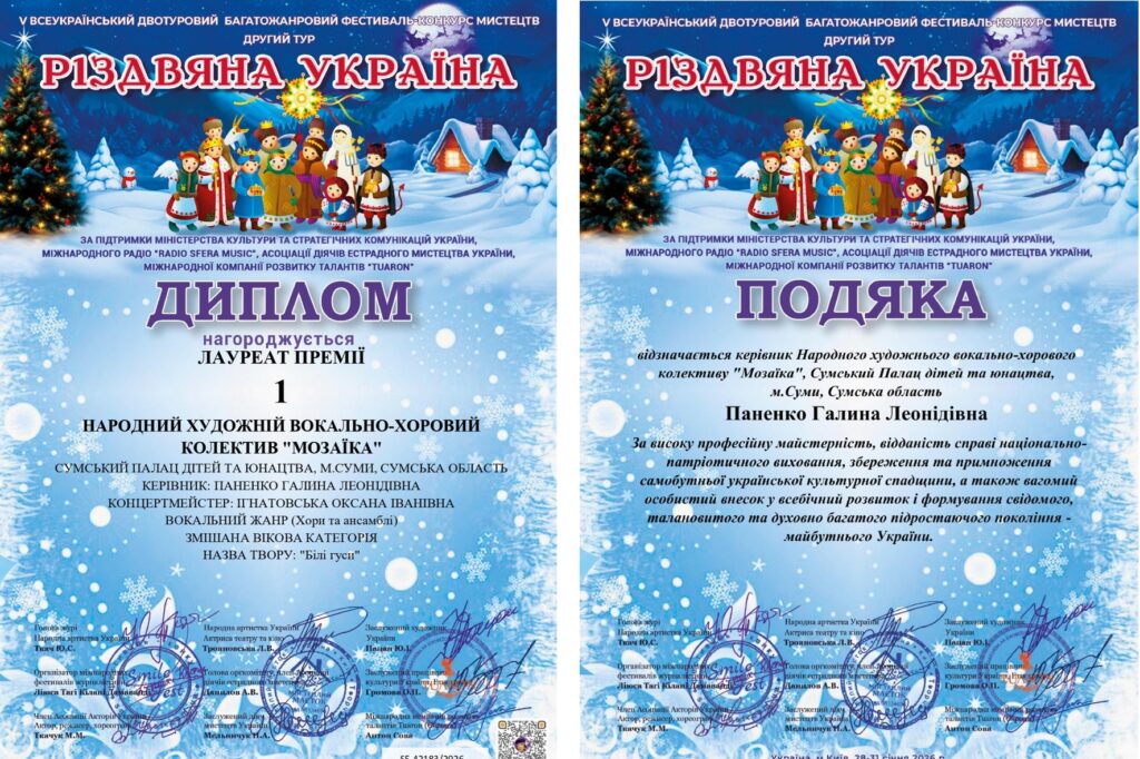 Народний художній Вокально-хоровий колектив «Мозаїка» гідно представив Сумський Палац дітей та юнацтва на V Всеукраїнському двотуровому багатожанровому фестивалі-конкурсі мистецтв «Різдвяна Україна», який відбувся 28–31 січня 2026 року в місті Києві.