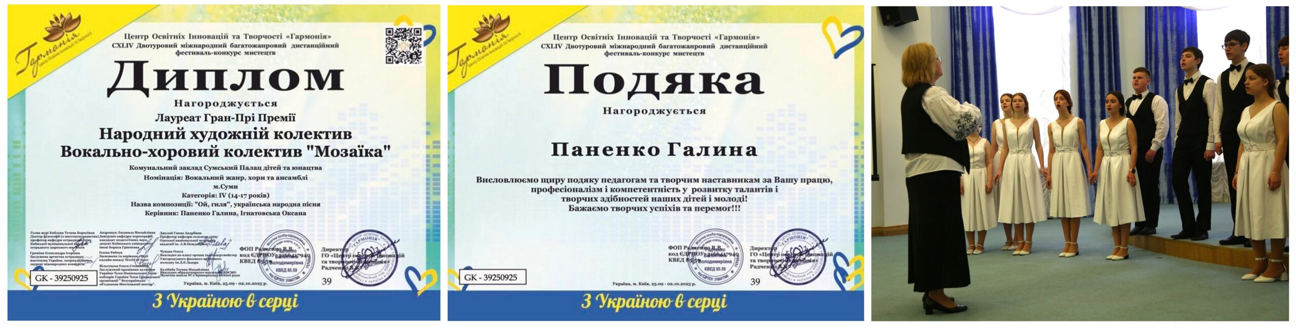 Вітаємо народний Вокально-хоровий колектив “Мозаїка” (керівник Галина Леонідівна Паненко) з перемогою в СХLIV Двотуровому міжнародному багатожанровому дистанційному фестивалі-конкурсі мистецтв та здобуттям Диплому лауреатів Гран-прі премії. Колектив представив на розсуд журі свою яскраву інтерпретацію української народної пісні”Ой, гиля” (українську народну пісню) у номінації “Вокальний жанр, хори та ансамблі”. Музичність, емоційність та артистизм юних виконавців не залишили байдужими членів журі.