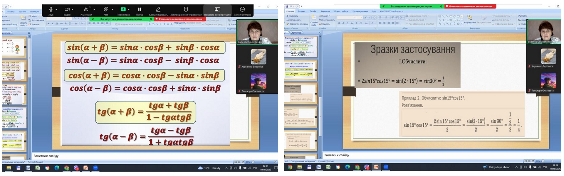 Під час заняття вихованці поглибили знання про властивості тригонометричних функцій, вчилися застосовувати отримані формули у практичних завданнях, розв’язували приклади підвищеної складності. Робота проходила в атмосфері активного пізнання та логічного мислення.