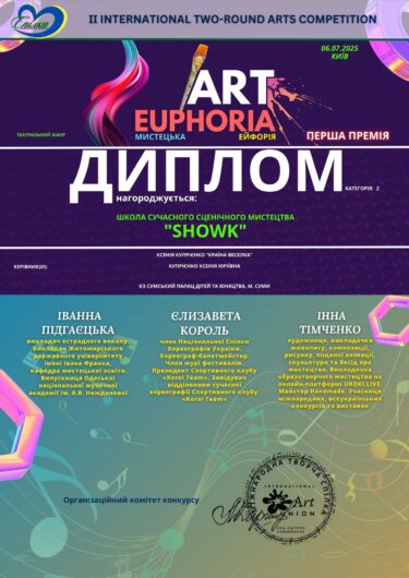 7 липня 2025 року в м. Київ вистава «Країна Веселка» найменших вихованців Школи сучасного мистецтва «ShowK» була представлена на II International Two-round Arts Competition «Art Euphoria». Журі високо оцінили роботу талановитих дітей та нагородили наших шовкових Першою премією. Вітаємо наших переможців та зичимо успіхів та нових здобутків і перемог!