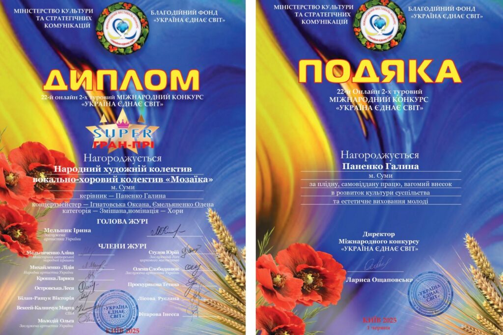 Вітаємо народний Вокально-хоровий колектив “Мозаїка” з найвищою нагородою Гран-прі у дистанційному ХХІІ Міжнародному благодійному фестивалі-конкурсі “Україна єднає світ”