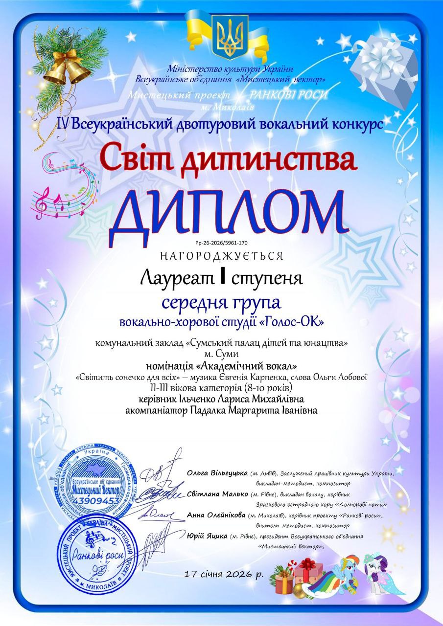 Середня група Вокально-хорової студії «Голос-ОК» стала лауреатом І ступеня IV Всеукраїнського двотурового вокального конкурсу «Світ дитинства», що відбувся 17 січня 2026 року в межах мистецького проєкту «Ранкові роси» (м. Миколаїв).